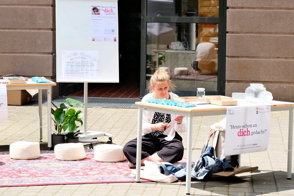 In diesem Projekt, das von Prof. Dr. Katrin Allmendinger und Anke Pfeiffer geleitet wird, geht es darum, die mentale Gesundheit von Studierenden mit Kursangeboten zu fördern. Auf der HFT-Allee wurde dieses Projekt von Clara Ehrmann, Wissenschaftliche Mitarbeiterin bei ReMind und Studentin im Master-Studiengang Wirtschaftspsychologie, vertreten. Das Event ist ganz in ihrem Sinne: „Mir gefällt es, dass man in einer so lockeren Atmosphäre ungezwungen durchschlendern und sich überall Anregungen und Impulse mitnehmen kann. Es ist schön, wenn Studierende hier am ReMind-Stand innehalten, sich einen Moment Zeit nehmen, um unsere Achtsamkeits-Challenge zu machen und wir miteinander ins Gespräch kommen. So gelingt es mir, an den Menschen Anteil zu nehmen, auf sie einzugehen und ihnen gute Gedanken und Worte für den Tag mit auf den Weg zu geben.“