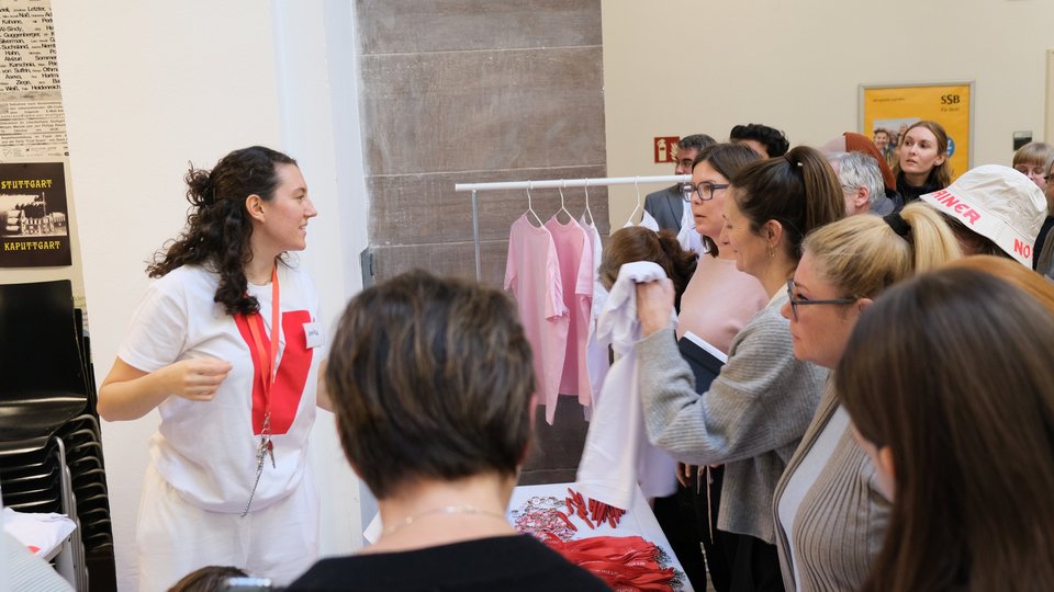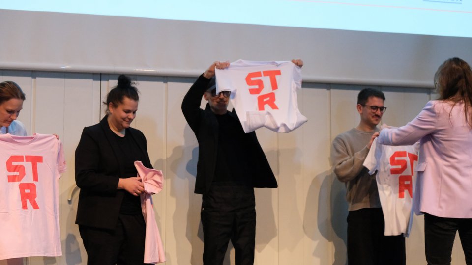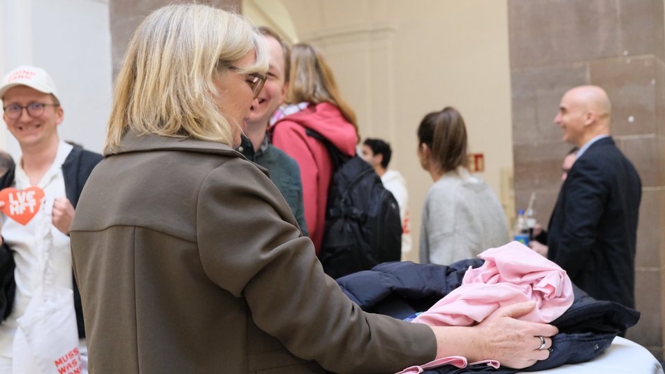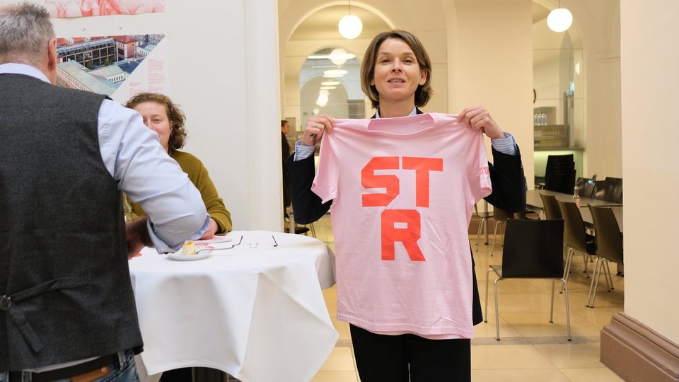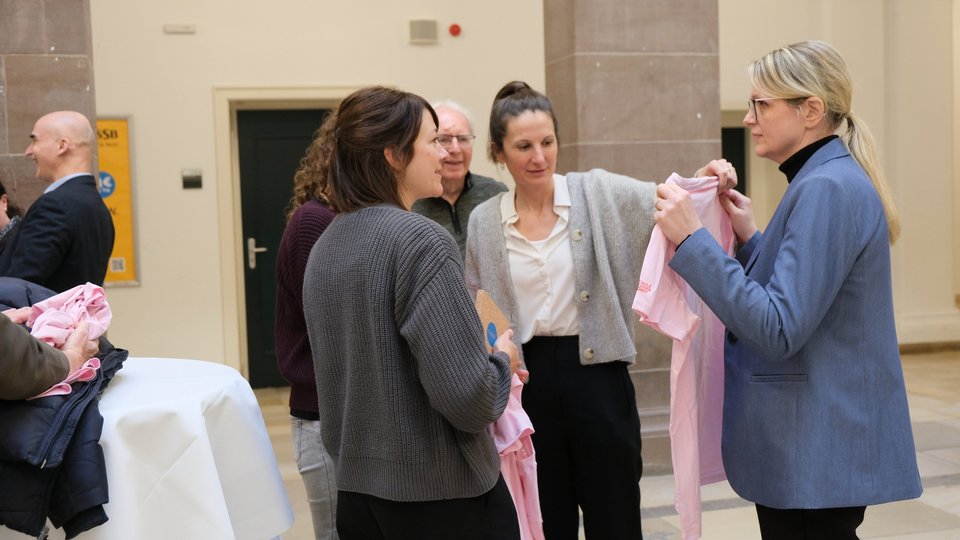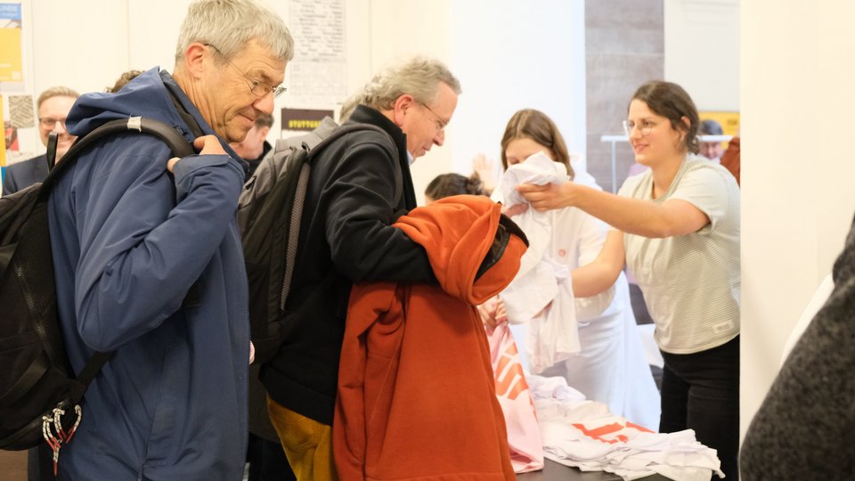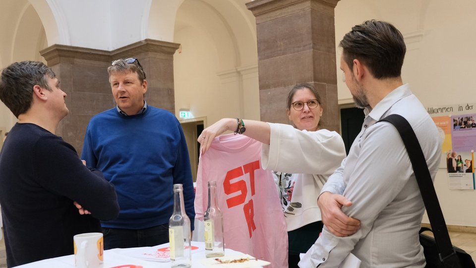 Rektorin Prof. Dr. Katja Rade überreicht ein Dankeschön-T-Shirt an Tanja Sperl, Creative Consultant/Hochschulkommunikation, Andreas Uebele und seinen Mitarbeiter Maks Barbulovic, Büro Uebele Visuelle Kommunikation, sowie an Bettina Laser, Leiterin Hochschulkommunikation (v.l.n.r.) und an Prof. Dr. Kristina Weichelt-Kosnick, wissenschaftliche Leiterin der Hochschulkommunikation. Und dann begann der Run auf die T-Shirts und Artikel mit neuem Design - und natürlich auch auf das Buffet.