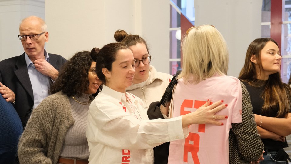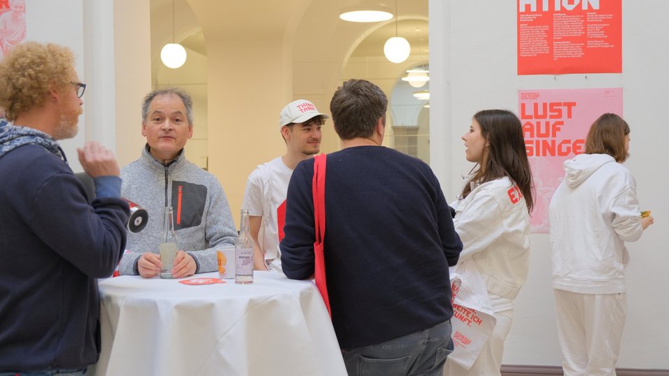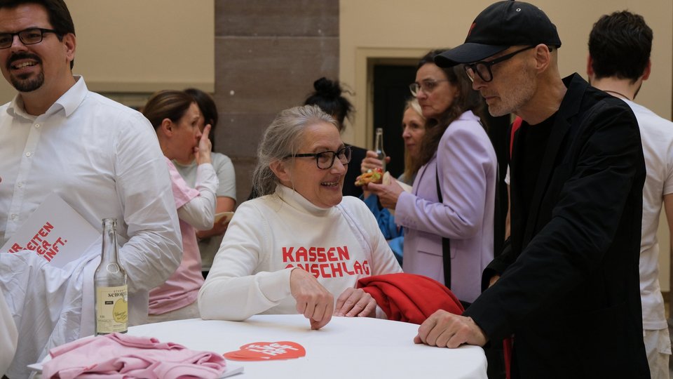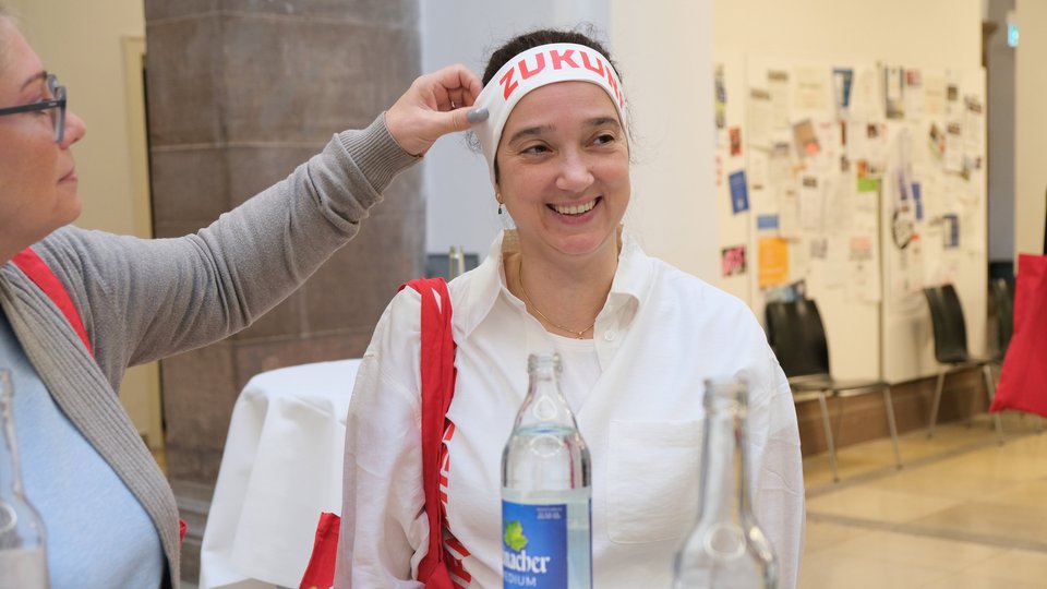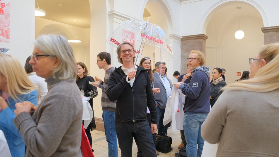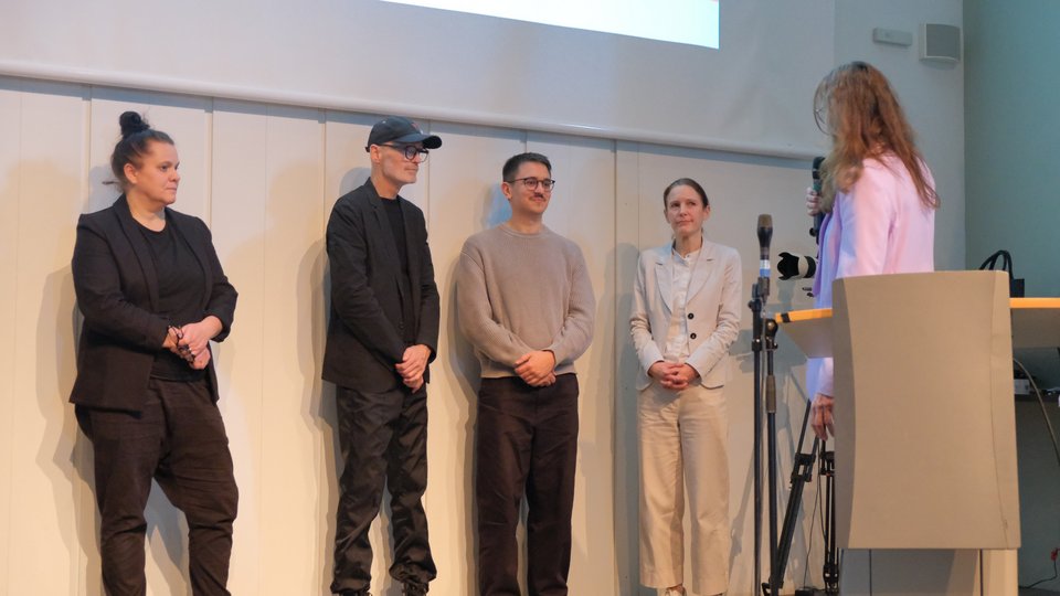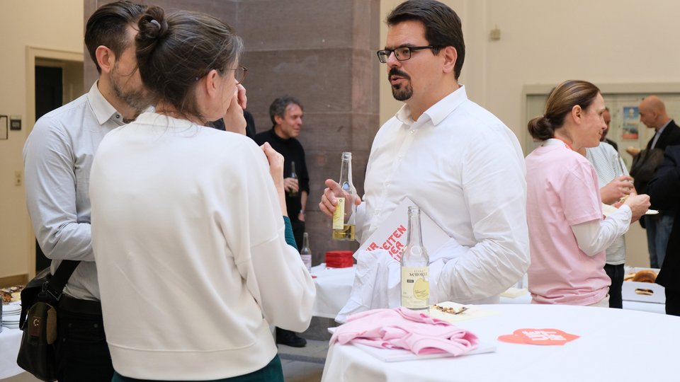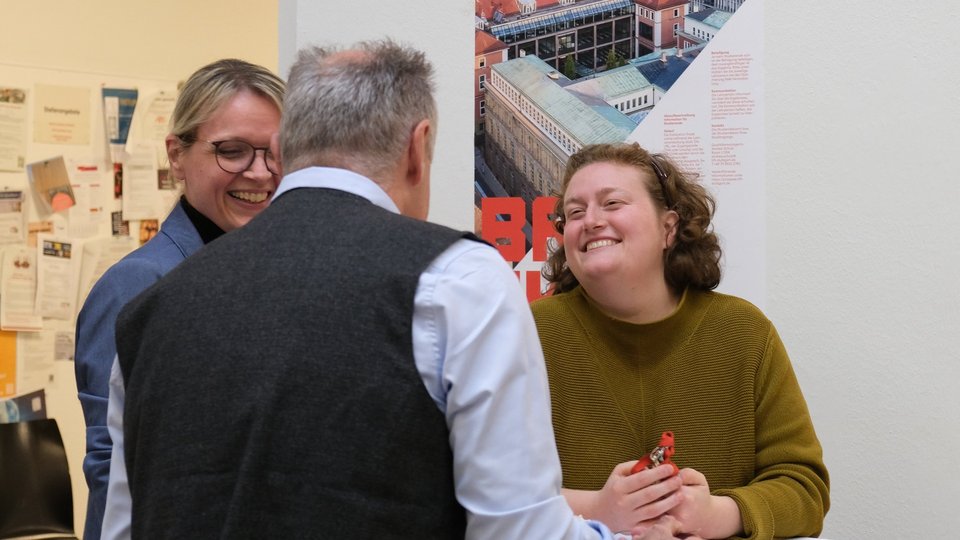 Rektorin Prof. Dr. Katja Rade überreicht ein Dankeschön-T-Shirt an Tanja Sperl, Creative Consultant/Hochschulkommunikation, Andreas Uebele und seinen Mitarbeiter Maks Barbulovic, Büro Uebele Visuelle Kommunikation, sowie an Bettina Laser, Leiterin Hochschulkommunikation (v.l.n.r.) und an Prof. Dr. Kristina Weichelt-Kosnick, wissenschaftliche Leiterin der Hochschulkommunikation. Und dann begann der Run auf die T-Shirts und Artikel mit neuem Design - und natürlich auch auf das Buffet.