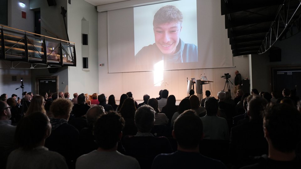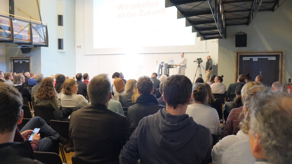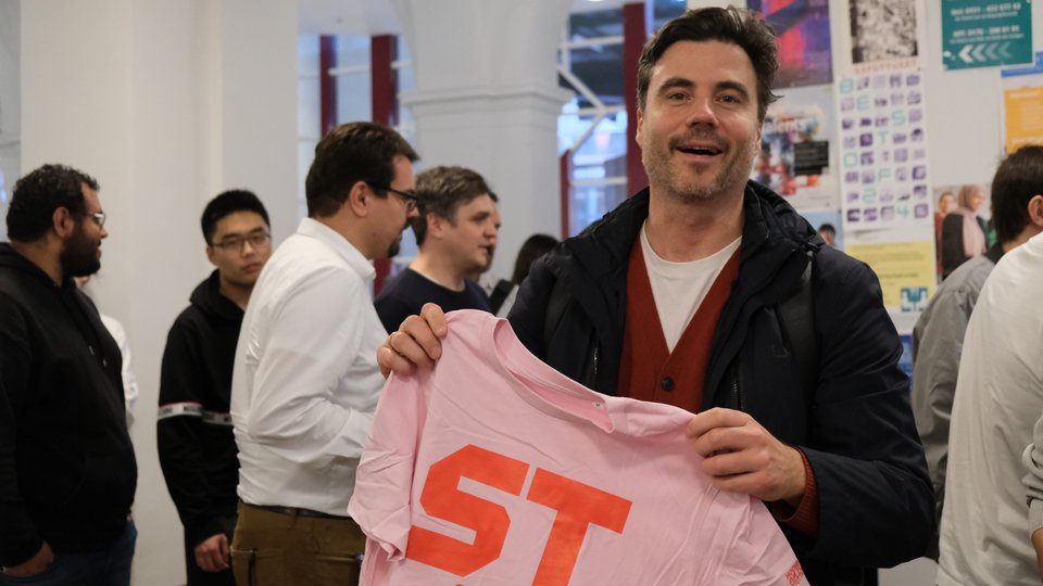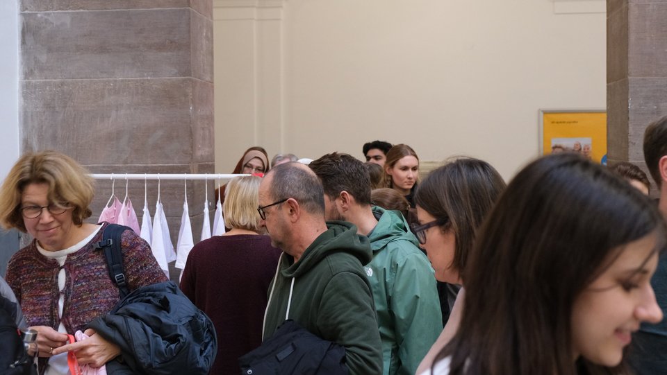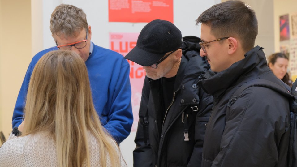 Andreas Uebele präsentiert die Entwicklung der Schrift, HFT-Studierende und -Mitarbeitende tragen Produkte mit Beispielworten aus dem Hochschulbereich, die mit einem Typo-Walk vorgestellt wurden.