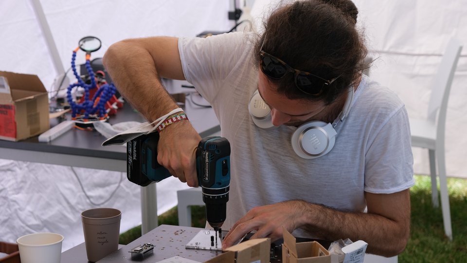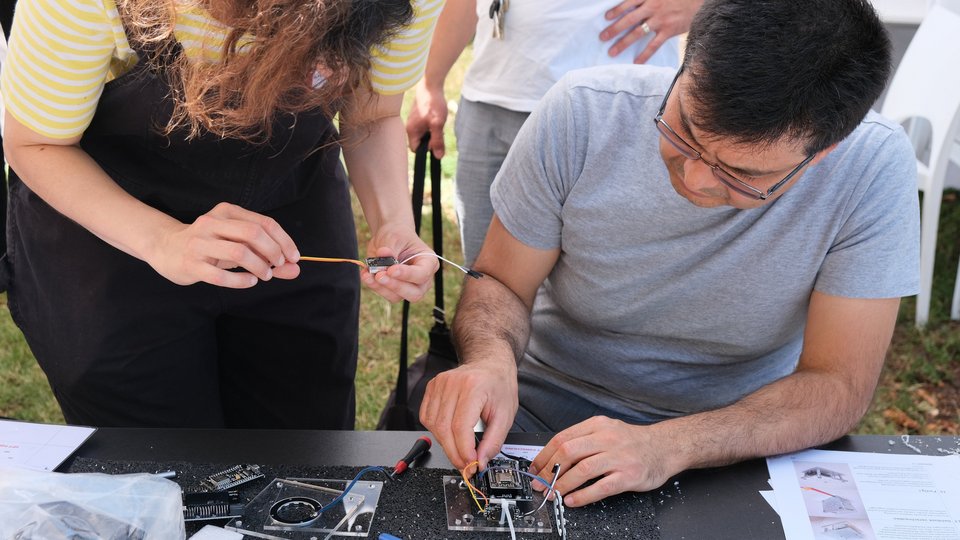 Die CO2-Ampel der HFT Stuttgart misst die Luftqualität und zeigt rechtzeitig auf, wann es Zeit ist, zu lüften. Besucher:innen konnten für sich eine CO2-Ampel basteln. Neben der Montage des Gehäuses - Arbeitsschritte: Bohren, Feilen, Sägen - mussten elektronische Komponenten gelötet und zusammengesteckt werden. Die Ampel wurde vor Ort mit der entsprechenden Software programmiert.