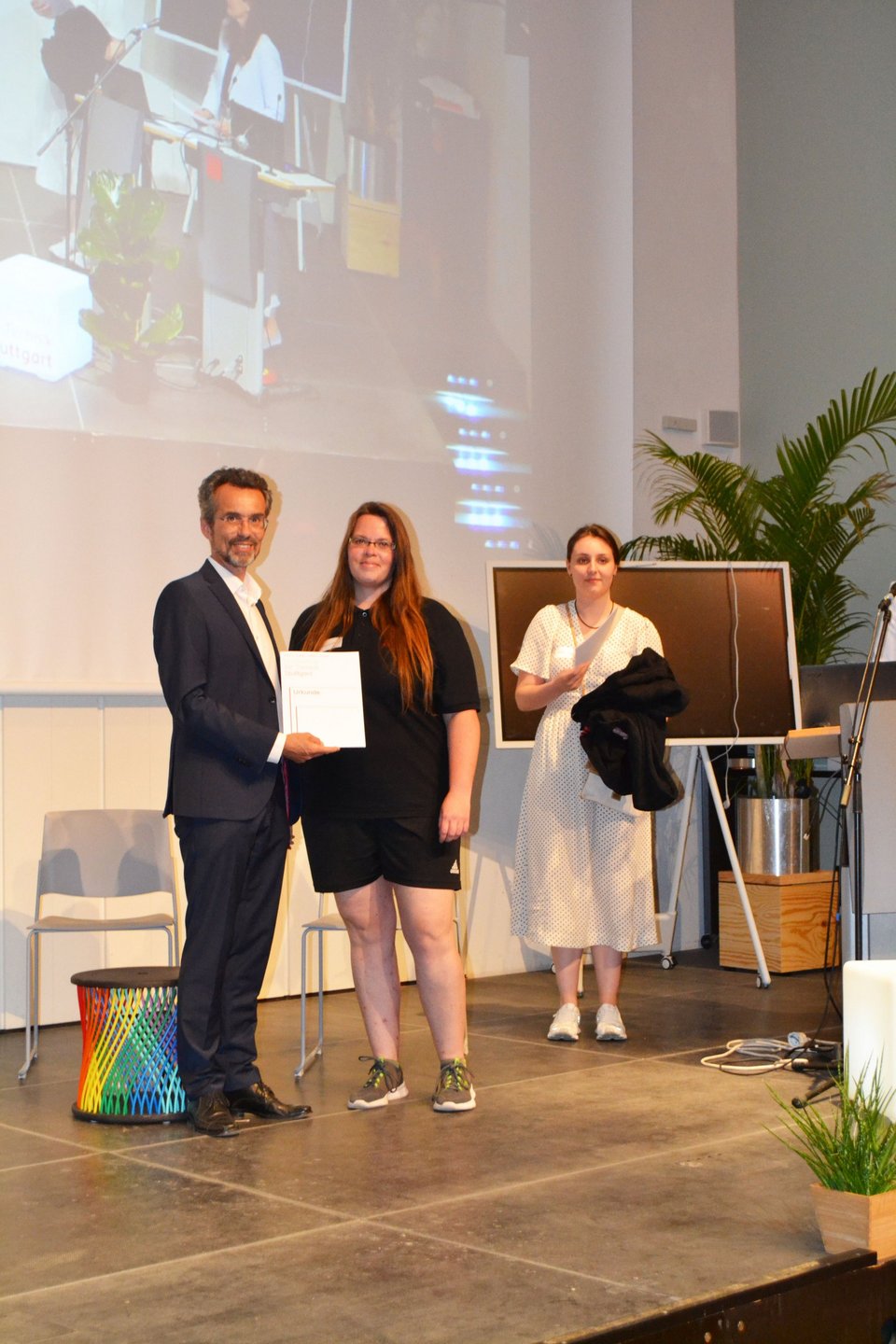 Der Preis für das studentische Engagement ging in diesem Jahr an Ann-Kathrin Brodel (Fakultät A, MA Architektur), Linus Häberle (Fakultät B, BA Wirtschaftspsychologie) und Stefanie Prahl (Fakultät C, BA Vermessung und Geoinformatik) für ihr herausragendes, hochschulweites Engagement in unterschiedlichen Hochschulgremien und darüber hinaus. Der Preis in einer Gesamthöhe von 600 Euro wurde vom Verein Freunde der HFT Stuttgart gesponsert und durch den Vorsitzenden Herrn Bernd Göhner überreicht.