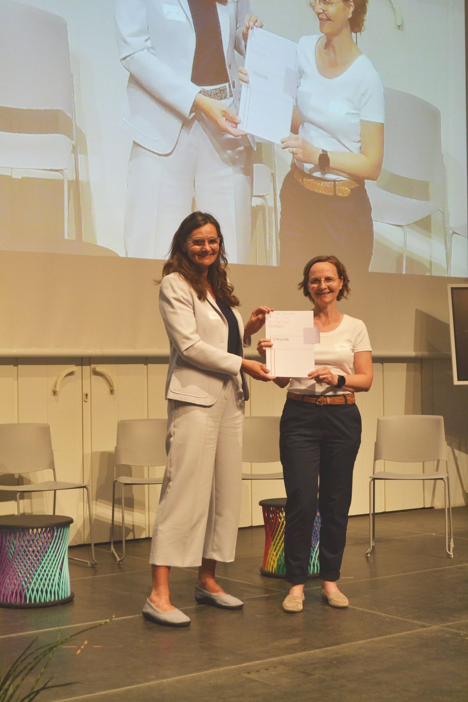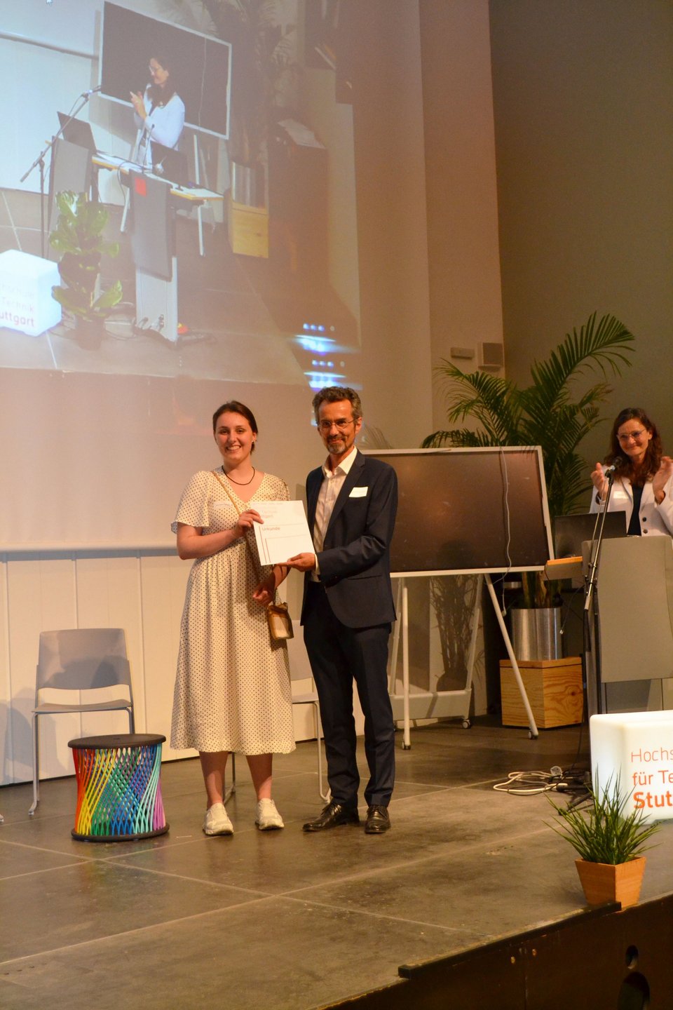 Der Höhepunkt der Veranstaltung bildete die Verleihung des Lehpreises und des Preises für studentisches Engagements. Der Lehrpreis würdigt herausragende Lehrende für ihre innovativen Lehrmethoden und ihren Beitrag zur Weiterentwicklung von Lehre und Studium an der HFT Stuttgart. Gewinnerinnen des 4. Lehrpreises 2023 in Höhe von 5000 Euro waren Prof. Christine Kappei (Fakultät A) und Prof. Dr. Siri Krauß (Fakultät B) für ihr studiengangsübergreifendes Lehrkonzept BIM AVA und Baubetriebswirtschaft I. Frau Rade betonte in ihrer Laudatio, dass die beiden Professorinnen überzeugend darlegen, wie die interdisziplinäre Zusammenarbeit zwischen Studierenden der Architektur und des Bauingenieurwesens im digitalen Ausschreibungs- und Vergabeverfahren ermöglicht werden kann. Die Studierenden reflektieren in der Veranstaltung in besonderer Weise das eigene fachliche Handeln, indem die Konsequenzen ihrer Entscheidungen in der interdisziplinären Zusammenarbeit unmittelbar erlebbar werden. Auch wenn nur ein Lehrpreis vergeben wurde, machen die eingereichten Konzepte deutlich, wie hoch die Lehrqualität an der Hochschule ist. Alle drei Fakultäten waren unter den besten Konzepten vertreten und haben überzeugende Lehr- und Lernszenarien präsentiert, die auch über den Gallery Walk hinaus im Confluence Wiki, präsentiert werden sollen.