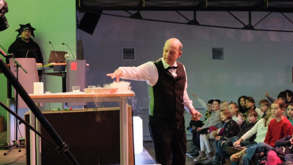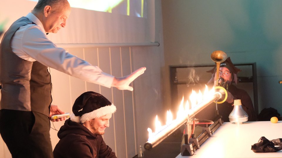 Und nein, es waren nicht nur die Schokoladen-Weihnachtsmänner, die die Kinder am Ende mitnehmen durften, die diese Freude auslösten. Es war vor allem das Programm, das auf bewährte Art und Weise Prof. Dr. Andreas Beck und sein Team aus dem Studiengang Bauphysik präsentiert wurde. Es zog Kinder wie auch Erwachsene gleichermaßen in seinen Bann. Sie alle lauschten gespannt, um zu erfahren, was Kometen so alles auf ihrer Reise durch das Weltall erleben. Viele Experimente, beispielsweise mit Trockeneis sowie ein Feuerstrahl, der mit Trompetentönen gesteuert wurde, sorgten für Faszination.