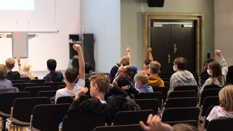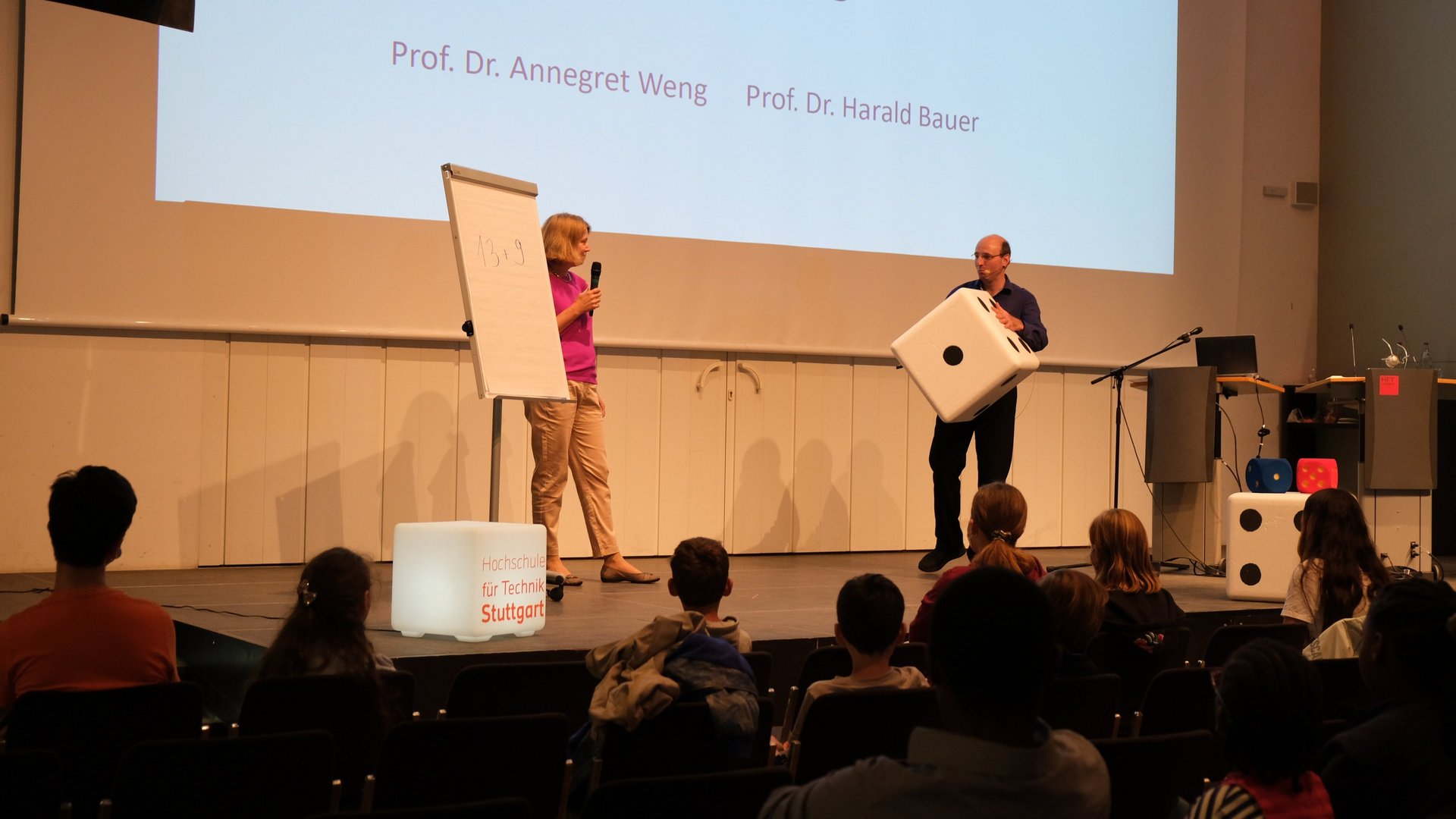 Die beiden Mathematik-Professor:innen Annegret Weng und Harald Bauer entführen die Kinder in die Welt des Zufalls und erklären, wie Mathematiker:innen auch dann rechnen können, wenn das Ergebnis völlig offen ist. Die Frage nach Wahrscheinlichkeiten schreckten die jungen Zuhörer:innen nicht ab - im Gegenteil: Bei Fragen der beiden Professor:innen wurden eifrig die Finger gestreckt und sowohl Vermutungen wie auch richtige Antworten gegeben. Trotz der hochsommerlichen Temperaturen waren die Kinder mit Eifer und Elan dabei und freuten sich im Anschluss an die Veranstaltung über Bastelbögen und Würfel aus Schokolade.