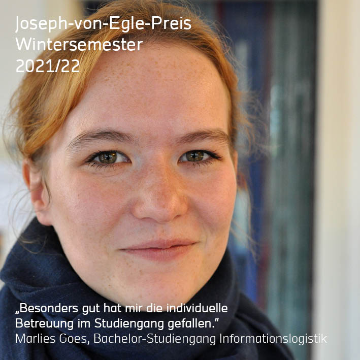 Den mit 1.000 Euro dotierten Joseph-von-Egle-Preis für den besten Bachelor-Abschluss erhält Marlies Goes aus dem Bachelor-Studiengang Informationslogistik. (Der Studiengang wird im Wintersemester 2022/23 in Digitalisierung und Informationsmanagement umbenannt.)