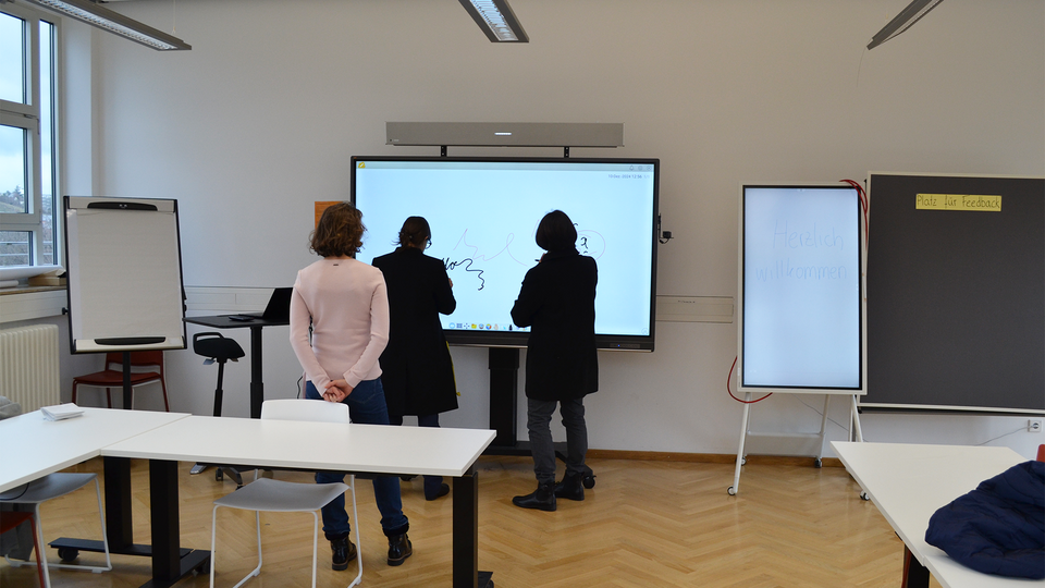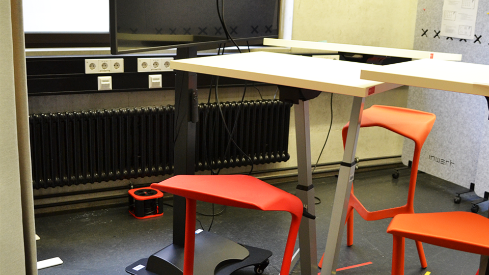 Das Raumlabor hingegen setzt Schwerpunkte auf den Einsatz moderner Medientechnik, darunter fallen auch Möglichkeiten für den digitalen Tafelersatz und hybride Lehr-/Lernszenarien. Für das Raumlabor wurden konkrete Nutzungsszenarien entwickelt, die Didaktik und Medientechnik ideal verzahnen und Raum für kreative Lernsettings schaffen: hybrid Active Learning Space, hybrid Frontal: digitaler Gastvortrag, digitaler Treffpunkt. Zusätzlich wird im Raumlabor das Zusammenspiel von Raumgestaltung und Lernprozessen mit Hilfe von Physical Learning Analytics datenbasiert untersucht. Diese Methode ermöglicht es, gezielte Empfehlungen für die Gestaltung von Lehr- und Lernszenarien abzuleiten und so die Lehrqualität kontinuierlich zu verbessern.