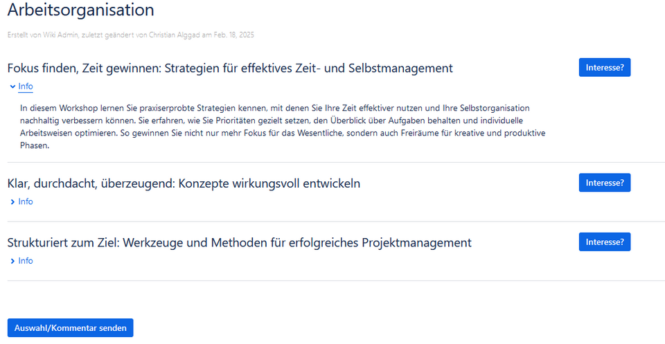 Unter den 6 Kategorien (unten links) verbergen sich Vorschläge für konkrete Workshops, die im nächsten Semester angeboten werden können. Eine kurze Beschreibung gibt es als Klapptext über den Button „Info“ (unten rechts in der Kategorie „Arbeitsorganisation“). Mit einem Klick auf den Interesse-Button ist eine Stimme für den jeweiligen Workshop abgegeben.
