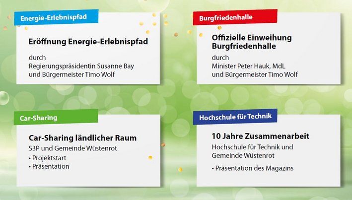 In der Gemeinde Wüstenrot gibt es einen doppelten Grund zum Feiern. Die Fertigstellung des Energie-Erlebnis-Pfads und die offizielle Einweihung der Burgfriedenhalle würdigt die Gemeinde mit einem Festakt mit hochrangigen Personen aus Politik und Wirtschaft. Mit einem bunten Programm, das unter anderem die Vorstellung des Magazin-Konzeptes der HFT zu Wüstenrot beinhaltet, wird den Bürgerinnen und Bürgern der Gemeinde der Energie-Erlebnispfad vorgestellt.