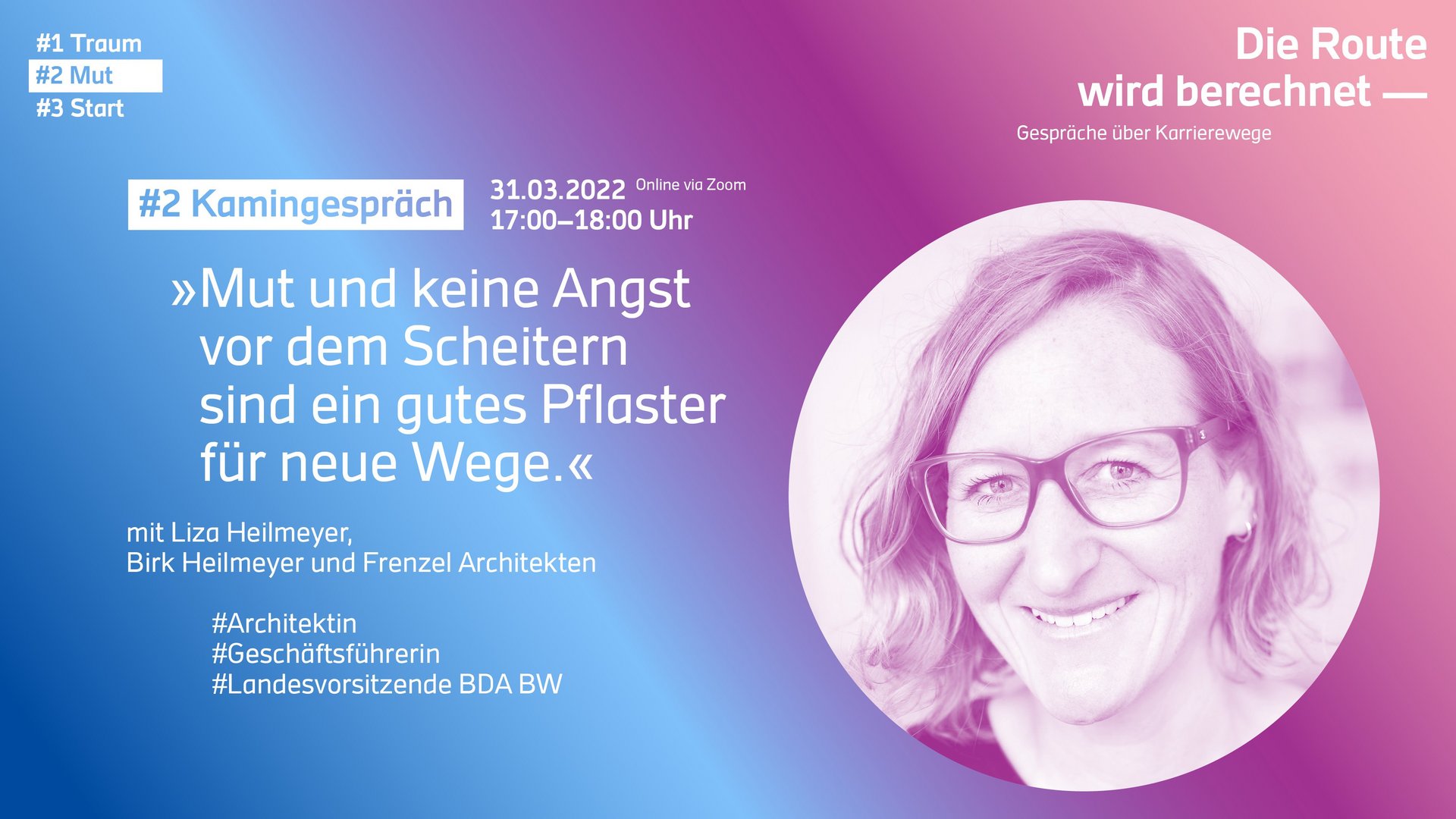 Beim zweiten Kamingespräch am Donnerstag, 31.März ist Liza Heilmeyer zu Gast. Sie hat als Stuttgarter Architektin das Architekturbüro Birk und Heilmeyer mitgegründet und ist inzwischen Vorsitzende des Bundes Deutscher Architekten Baden-Württemberg. Unzählige Preise hat Liza Heilmeyer bereits gewonnen. Wir sprechen in einer gemütlichen Kaminfeuerstimmung mit ihr über Karrierewege und diskutieren, welche Rolle Mut dabei spielt. Das Gespräch führt Franzi Glaser. Sie ist Moderatorin, Kabarettistin und Coachin und spricht mit ihrer lockeren Art offen und ehrlich über die Dinge, die wirklich wichtig sind.