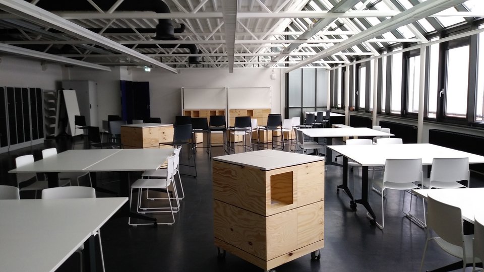 Der studentische Arbeitsraum im dritten Stock in Bau 3 hat sich Anfang 2022 in einen multifunktionalen Kreativraum gewandelt. Mit rollbaren Tischen und modularen Pixelboxen aus Holz lädt er zum gemeinsamen Arbeiten und Denken ein. Der Raum kann durch die flexiblen Möbel schnell umgebaut und vielfältig genutzt werden. Zum Beispiel als Workshop-Raum mit Tischgruppen, für einen Vortrag mit Sitzreihen oder für eine Ausstellung mit Tischen, die sich zu Präsentationsflächen zusammenklappen lassen.