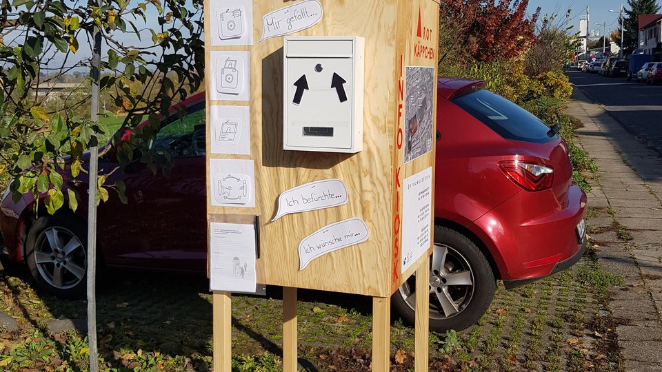 Im Oktober und November zur kalten Jahreszeit testen die Studierenden nur den Info-Kiosk und den Garten-Kiosk. Sie schieben die Rotkäppchen durchs Viertel und platzieren sie an verschiedenen Orten - am Café TaS, an der Auferstehungskirche, am Rotweg Ecke Roigheimer Straße. In Gesprächen mit Passantinnen und Passanten, die sich an den Kiosken ereignen, stellen die Studierenden fest, dass es durchaus ein Interesse an mehr nachbarschaftlicher Vernetzung und Informationen zum neuen Quartier gibt.