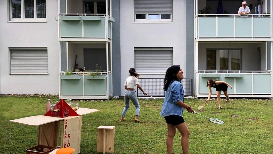 Der Spiele-Kiosk und der Sport-Kiosk können von den Nachbarn überall im Quartier selbstständig genutzt werden. Der Spiele-Kiosk ist ein aufklappbarer Tisch, in seinem Gehäuse kann man auch Hocker und Brettspiele unterbringen. Der Sport-Kiosk birgt Badminton-Schläger, Diskus-Scheibe und andere Sportgeräte.