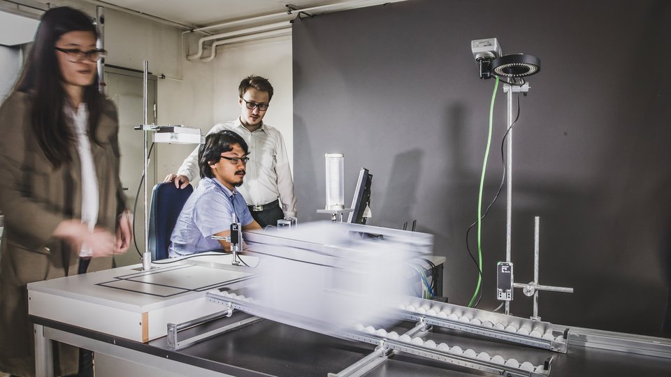 Die RFID Produktionsstrecke erlaubt es den Studierenden den praktischen Einsatz von RFID in der Industrie zu verstehen. Auf der Produktionstrecke können Kleinladungsträger über UHF- und HF-Transponder nachverfolgt und auch ausgelesen und beschrieben werden. Das Highlight bildet eine intelligente Kamera am Ende der Produktionstrecke, die über eine Farb-, Form- und 2D-Code-Erkennung den Kleinladungsträger überprüft. Mit Hilfe der Speicherprogrammierbaren Steuerung können alle Schritte der Produktionsstrecke von den Studierenden selbst bedient und zudem beispielsweise auch Statusanzeigen über Industrielichter gesetzt werden.