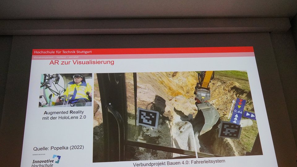 Prof. Dr. Alexander Beetz erläuterte in seinem Vortrag die Potenziale der Photogrammetrie für die ‚digitale‘ Baustelle und präsentierte innovative Anwendungen von Augmented und Virtual Reality in der Planung und auf der Baustelle. Zu AR/VR plant die HFT Stuttgart einen fächerübergreifenden Studiengang zu starten.