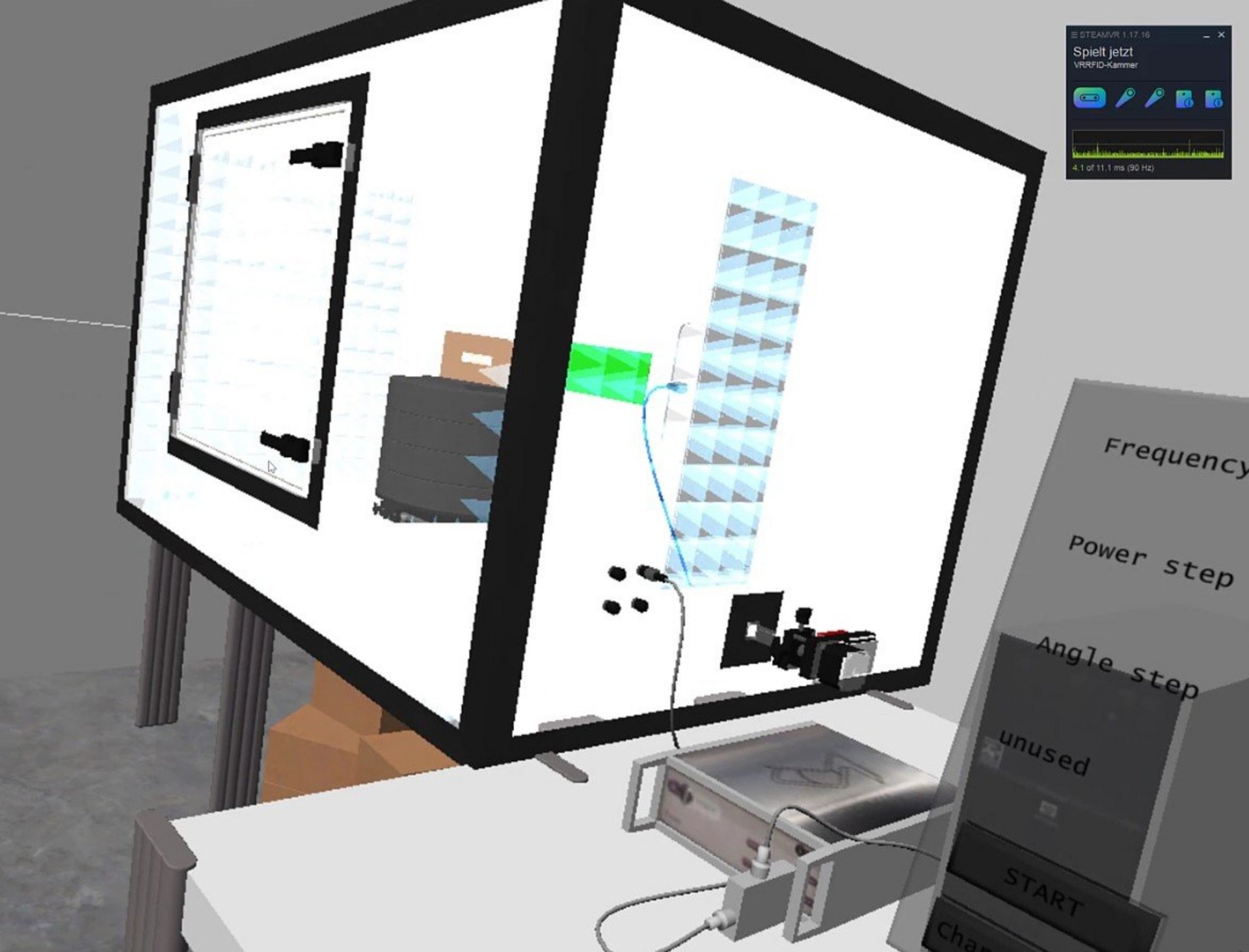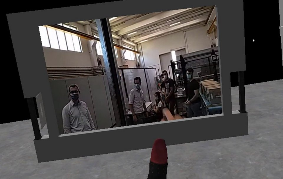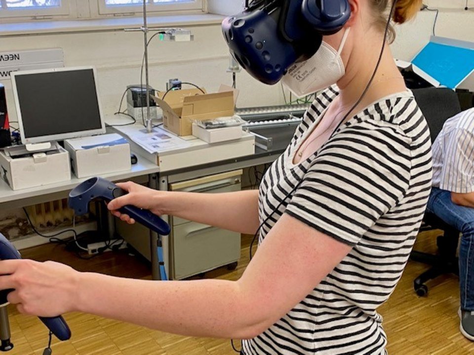 Um den Studierenden in diesem Semester eine Laborübung der etwas anderen Art zu bieten, nutzten die mit dem Studiengang kooperierenden Forscher*innen des Forschungsprojektes DigiLab4U die Gelegenheit eine hybride Laborübung zu pilotieren. Über eine Virtual Reality (VR) Laborumgebung, in die die Studierenden der HFT mit Hilfe einer VR-Brille „eintauchen“ konnten, kooperierten sie mit Studierenden der Universität Parma, die live via Augmented Reality (AR) Schnittstelle in die VR-Umgebung verbunden waren. Über die digitale Schnittstelle konnten die Studierenden virtuelle RFID Transponder austauschen, die an der HFT in einer virtuellen Messkammer getestet wurden. Die so getesteten Transponder wurden im Anschluss in der Laborumgebung der Universität Parma unter realen Bedingungen auf einem Förderband getestet. So wurden die realen Gegenstücke der virtuellen RFID Transponder in Parma auf einem Produktkarton befestigt, über ein Förderband transportiert und mittels entsprechender Antennen die Transponderfunktion getestet. Die Messergebnisse, die die Studierenden an der HFT in der virtuellen Messkammer ermittelt haben, wurden anschließend mit den Ergebnissen der realen Umgebung in Parma verglichen, um zu prüfen, wie ein Transponder sich in einem geschützten Bereich, wie es die Messkammer bietet, im Verhältnis zu einer realen Industrieumgebung verhält.