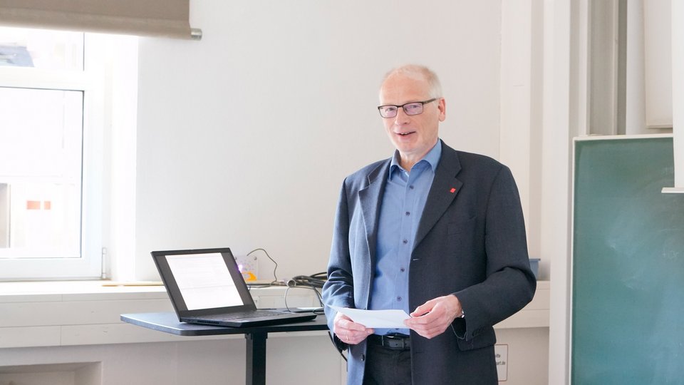 Die Einführung in den Studiengang gab Prof. Dr.-Ing. Hardy Lehmkühler. „Unser Studiengang ist zeitgemäß aufgestellt und unsere Absolvent:innen sind im Arbeitsmarkt gefragt“, betonte der HFT-Professor.