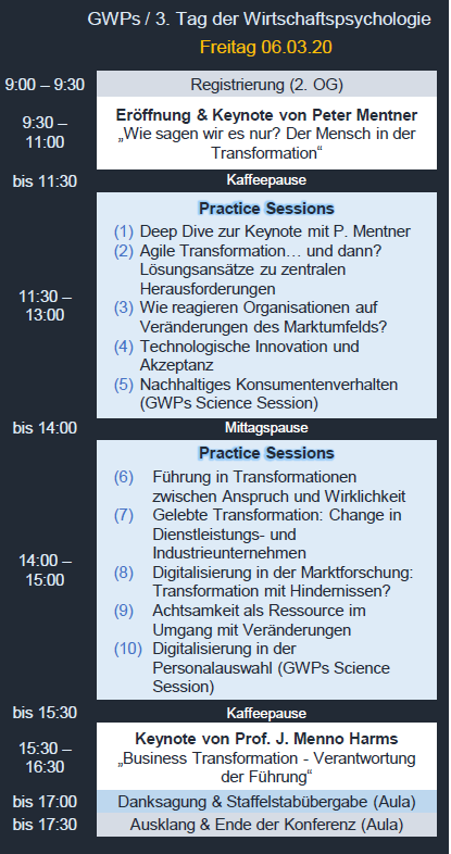 Im Einklang mit der zeitgleich stattfindenden 24. Fachtagung der GWPs wird sich der 3. Tag der Wirtschaftspsychologie ebenfalls mit aktuellen Herausforderungen auseinandersetzen. Hierbei erwartet Sie sowohl die besondere Perspektive der Unternehmensvertreter, welche die Transformationsprozesse im Unternehmensalltag aktiv leben als auch aktuellste Forschungserkenntnisse durch unsere Tagungsteilnehmer und Wissenschaftsexperten. In interaktiven Formaten sowie spannenden Fachvorträgen wird dabei Raum für den Wissenstransfer zwischen Praxis und Forschung geboten. Wir freuen uns darauf, gemeinsam mit Ihnen praxisrelevante Forschungslücken und Fragestellungen zu identifizieren sowie Lösungen und Lösungsansätze aus unterschiedlichen Perspektiven auszutauschen.